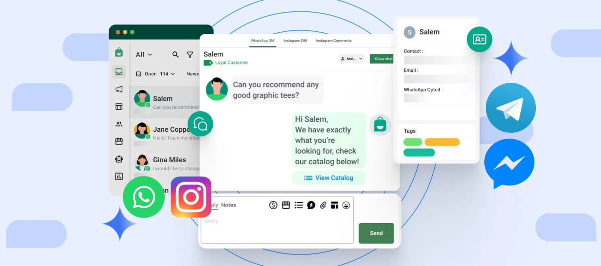 Satukan semua chat dari berbagai saluran penjualan seperti WhatsApp, Facebook Messenger, Instagram, Telegram, Webchat dan Marketplace (Shopee, Tokopedia, TikTok dan Blibli) dalam satu inbox yang mudah digunakan.